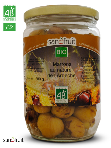 Châtaignes entières Bio décortiquées Sanofruit. Sans sel ni sucre ajouté, prêtes à consommer.